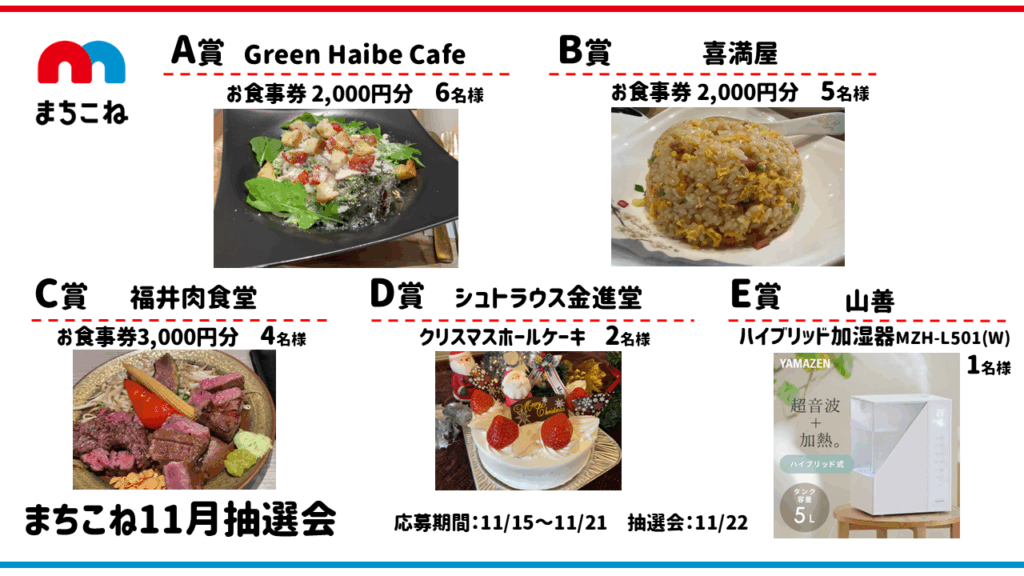 2025.11.15 抽選会情報 2025.11まちこね抽選会 応募期間 11/15~11/21 抽選会 11/22 景 品 紹 介 A賞 Green Haibe Cafe お食事券2,000円分 6名様 B賞 喜満屋 お食事券2,000円分 5名様 C賞 福井肉食堂 お食事券3,000円分 4名様 D賞 シュトラウス金進堂 クリスマスホールケーキ 2名様 E賞 山膳 ハイブリッド加湿器MZH-L501(W) 1名様